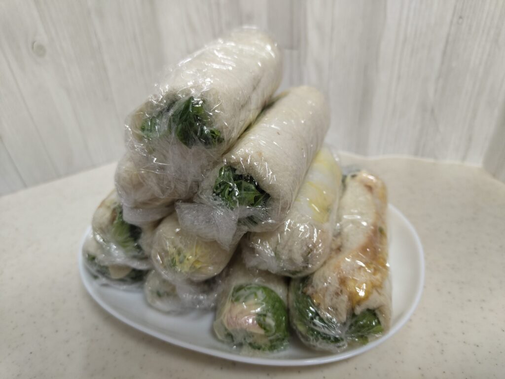 - 具材とパンを馴染ませ形を安定させるために冷蔵庫で15分程度落ち着かせた後、ラップごと包丁で切る